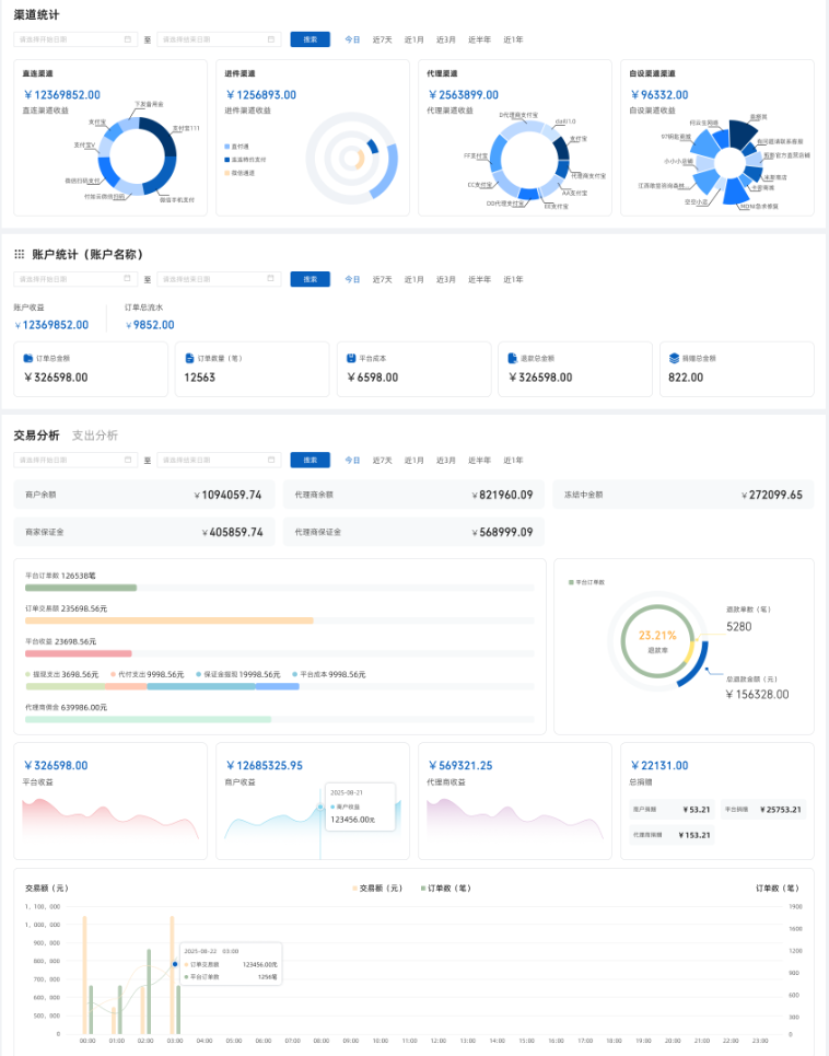 - 核心统计数据(订单数、金额、收入、退款等)